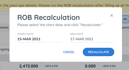 Once the user clicks on that "Run Recal Process" button, a popup modal will appear to allow user to select the date for the function to start running from: