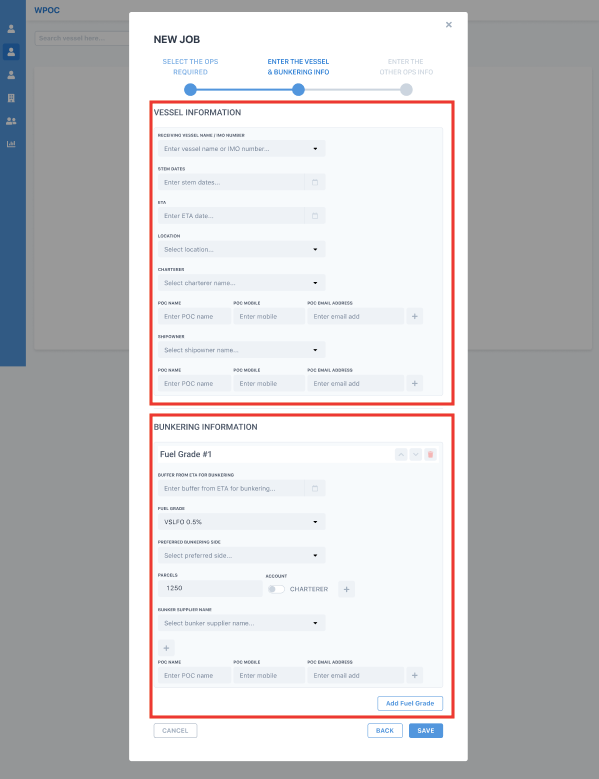 At the 2nd step of the add job flow, the user is able to enter the timing details of the Receiving Vessel's (RV) port call and the bunkering details.